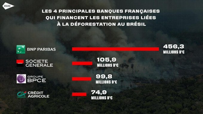 At least I know the ribs aren’t from any of the Brazilian cows that the four French banks listed below are massively invested in. According to a report released yesterday by 5 NGOs and media outlets, the four banks have put 743 million euros into agribusinesses that are wiping out the Amazon forest. This year, deforestation in the Brazilian Amazon is at an all-time high, with 9,500 km2 of forest cut down to graze cattle or to plant soya for their fodder. “Between January 2021 and September 2022 alone, BNP Paribas invested nearly EUR 117 million in the activities of several agribusiness giants involved in the deforestation of the Amazon and the Cerrado.” And all four banks have made very public commitments to “no longer finance companies producing or buying beef and soya from land cleared or converted after 2008 in the Amazon.” In the Cerrado, in Brazil, BNP Paribas “encourages its clients not to produce or buy beef and soya from cleared or converted land after 1 January 2020.”