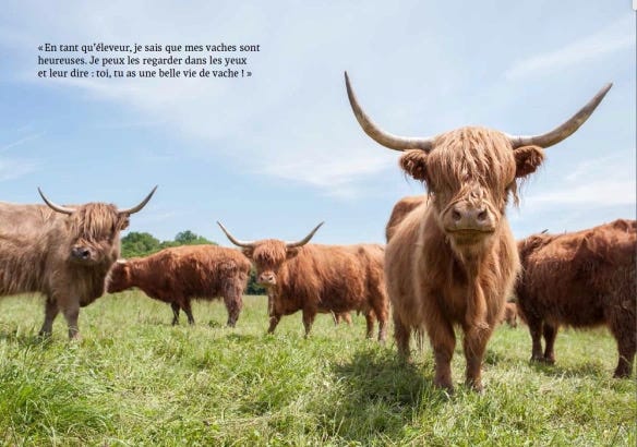 Where's the beef (from)? This image of highland cows in Moustier-en-Fagne in the north of France is from Camille Labro’s book Fourche & Fourchette (“Pitchfork to Fork”). The caption in the top left corner is a quote by the cows’ breeder, Grégory Delassus: “I know my cows are happy. I can look them in the eye and tell them: you have a beautiful cow's life!”